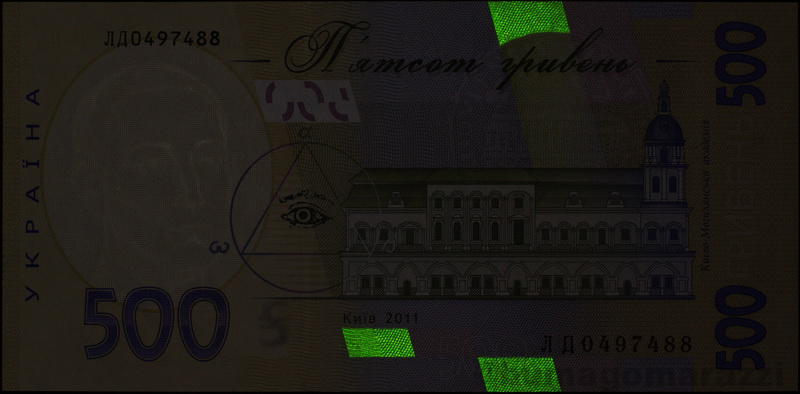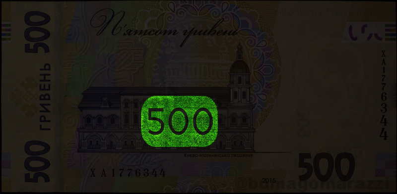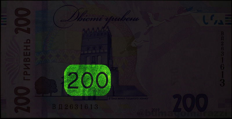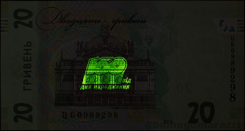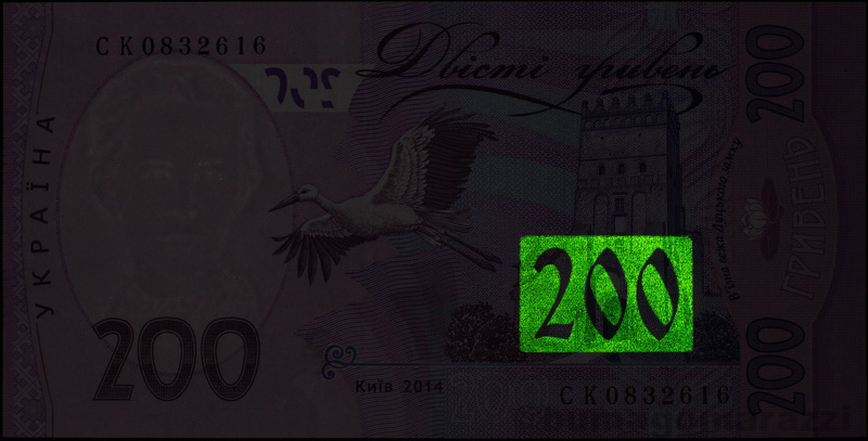 В Интернете можно найти информацию об использовании антистокс-защиты на украинских гривнах последней серии (P126-P128, Pnew) и крупных номиналах предпоследней (P123, P124) - так и есть, вот они, нанесены, по расположению частично совпадают с УФ-метками, светятся... Но не на всех, свежие 20 (непамятные) и 50 гривен вышли без антистокс-защиты. Любопытная деталь - памятная двадцатка 2016 года имеет метку в виде не просто номинала, а юбилейно-специализированного узора. Недавний памятный выпуск, посвященный 30-летию Независимости проверить не удалось.