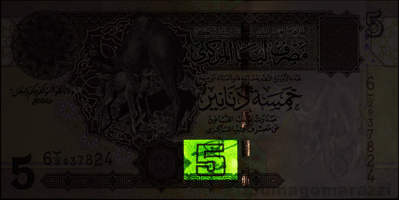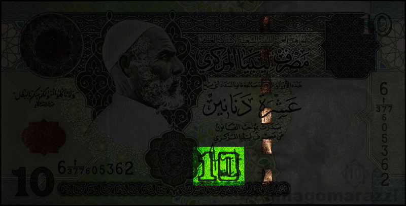 На шестой серии ливийских динаров (P68-P70) также присутствует антистокс-метка в виде цифры номинала, аналогично китайским юаням. Последующие выпуски ливийских банкнот (включая 20 и 50 динаров, напечатанных Гознаком) утратили этот защитный признак.