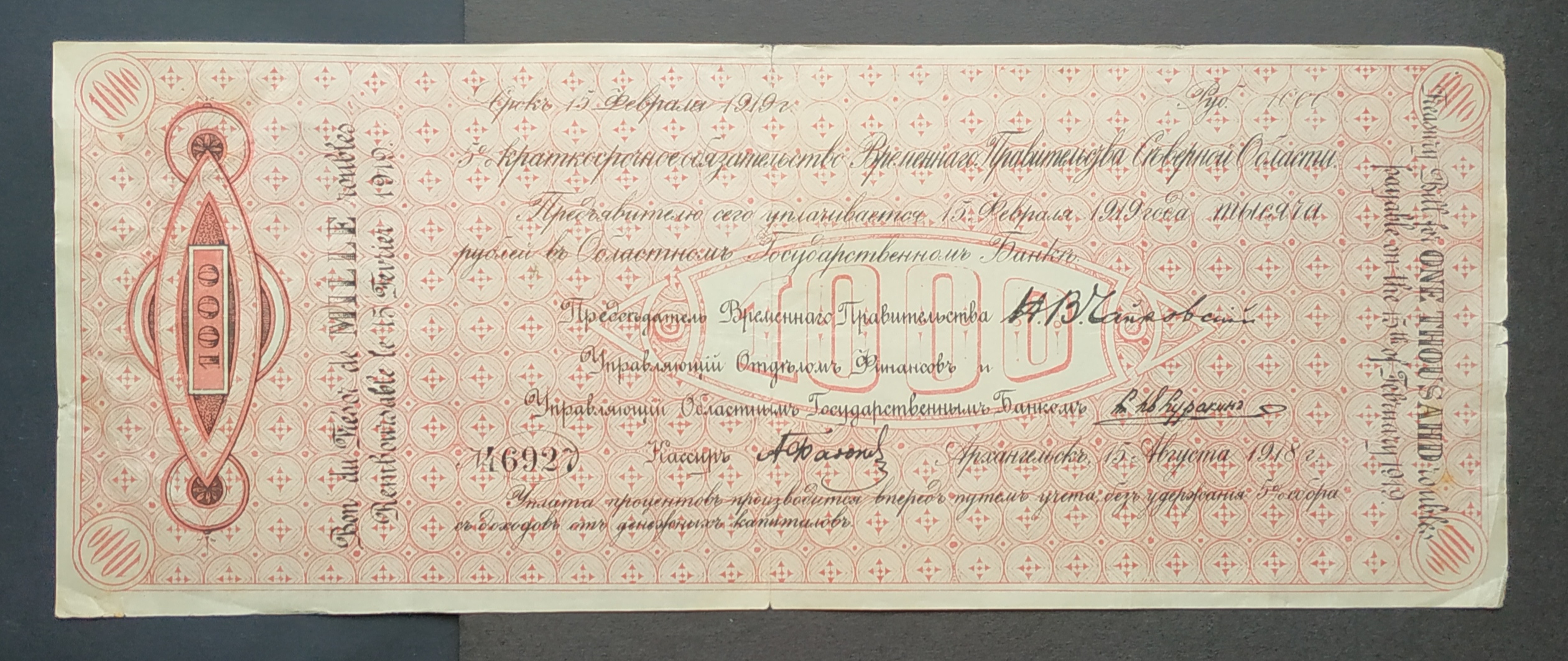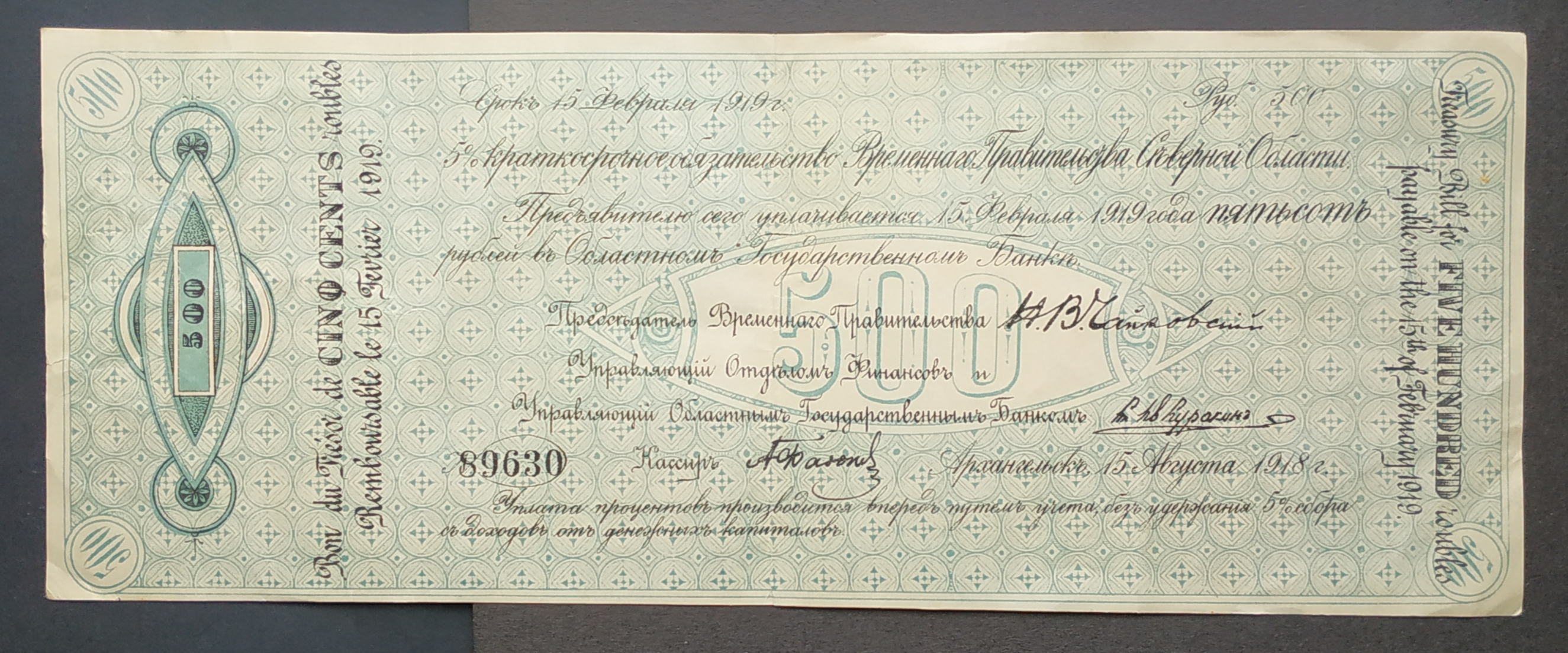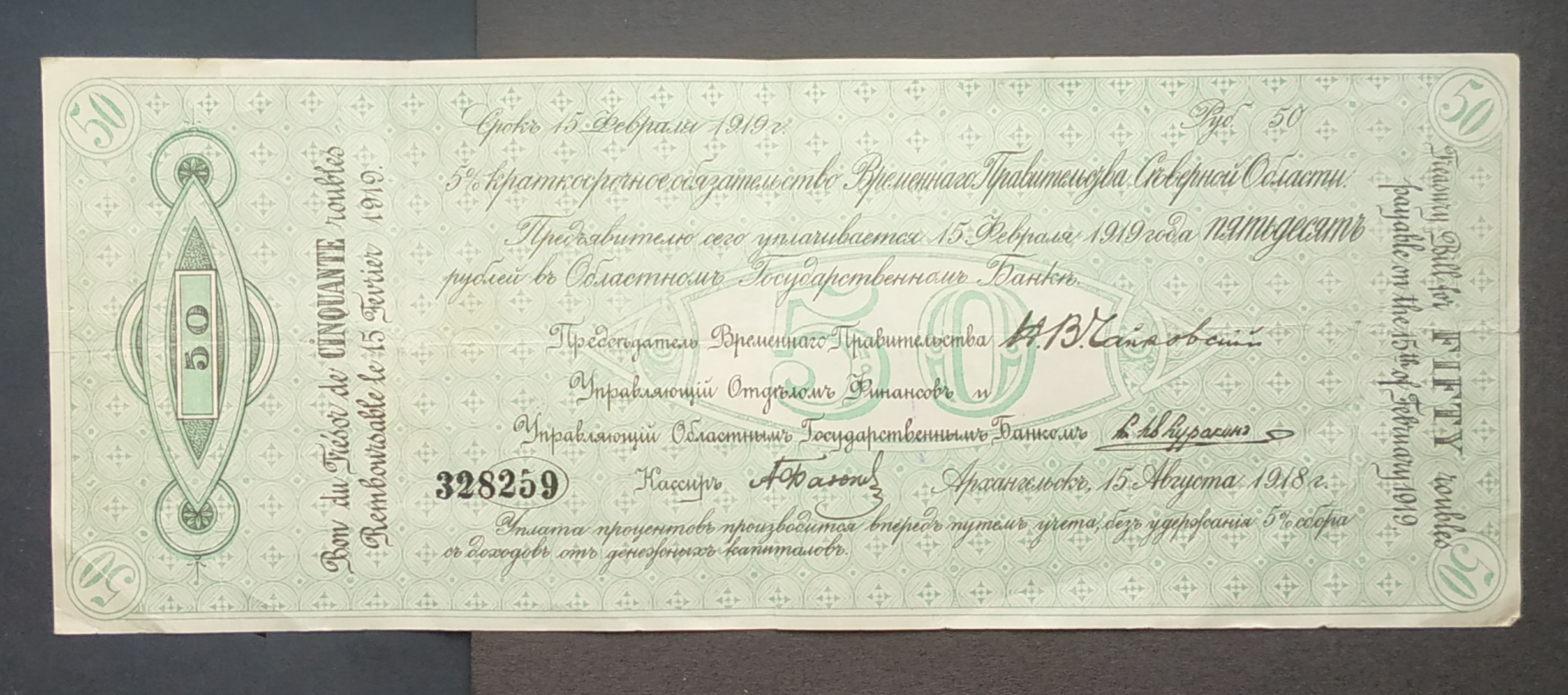 5 % Краткосрочное обязательство временного правительства Северной области. 50, 100, 500 и 1000 рублей 1919 года. Состояние на фото.