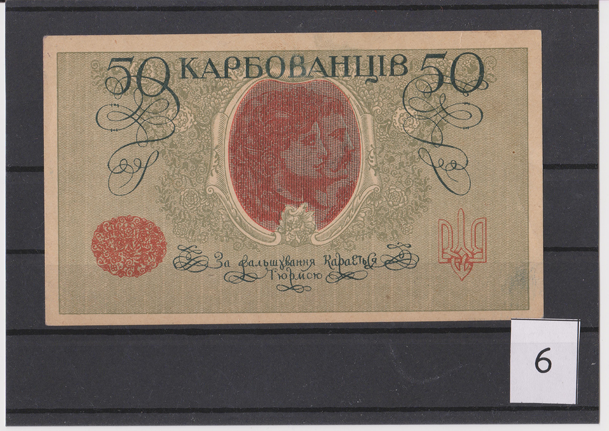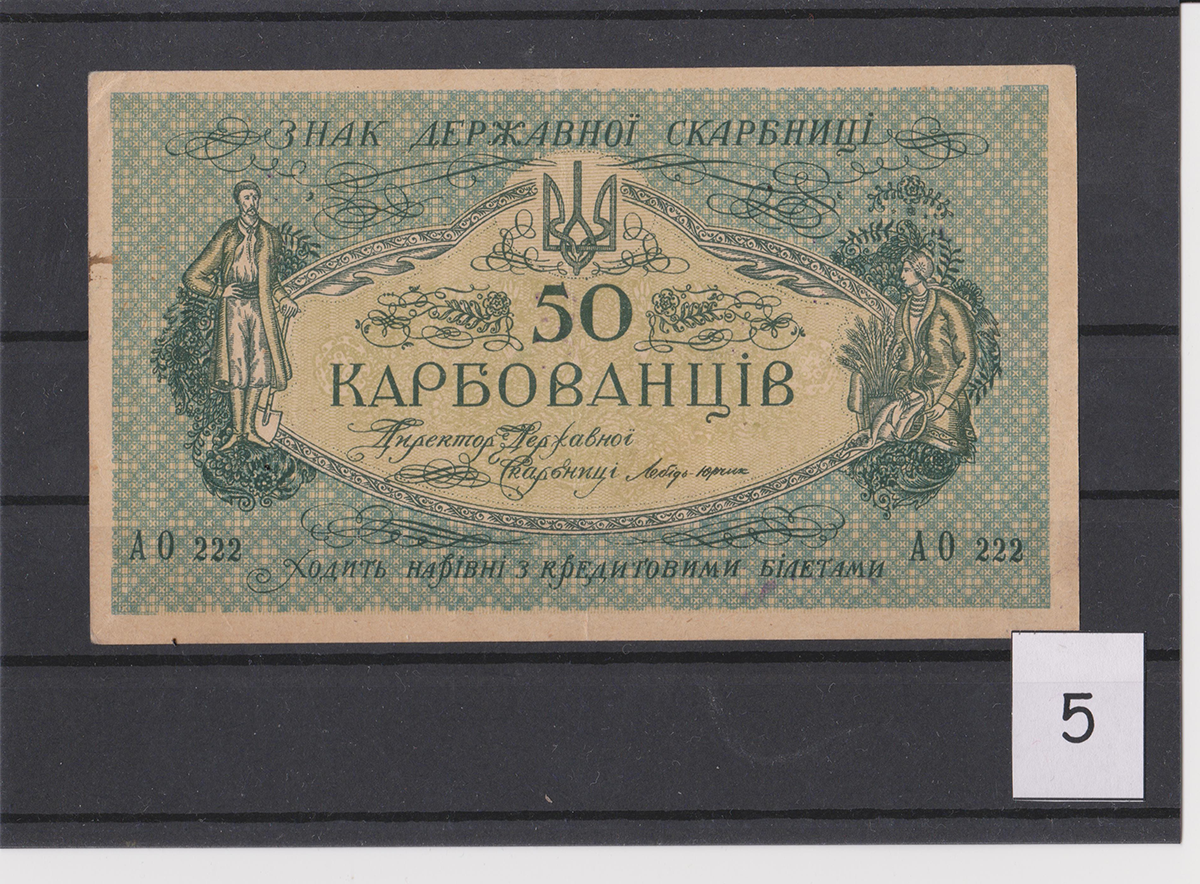 Стр. 38, № 6 2), 50 карбованцев. Известен стандартный образец из двух половинок. серия АО 210. Сообщил и предоставил скан В. Любченко, г. Киев
