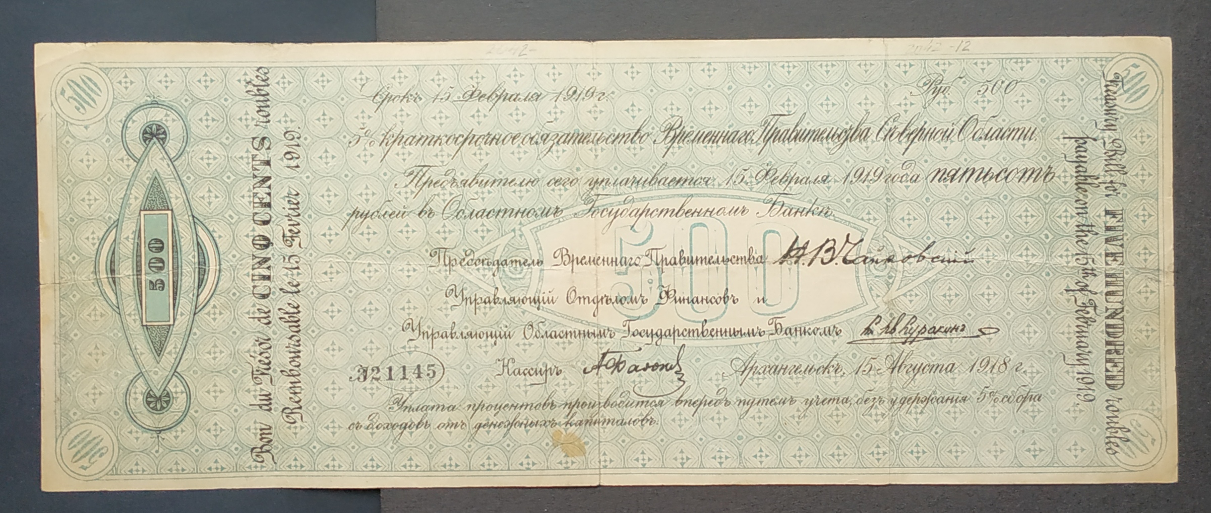 5% Краткосрочное обязательство временного правительства Северной области. 500 рублей 1919 года. Состояние на фото.