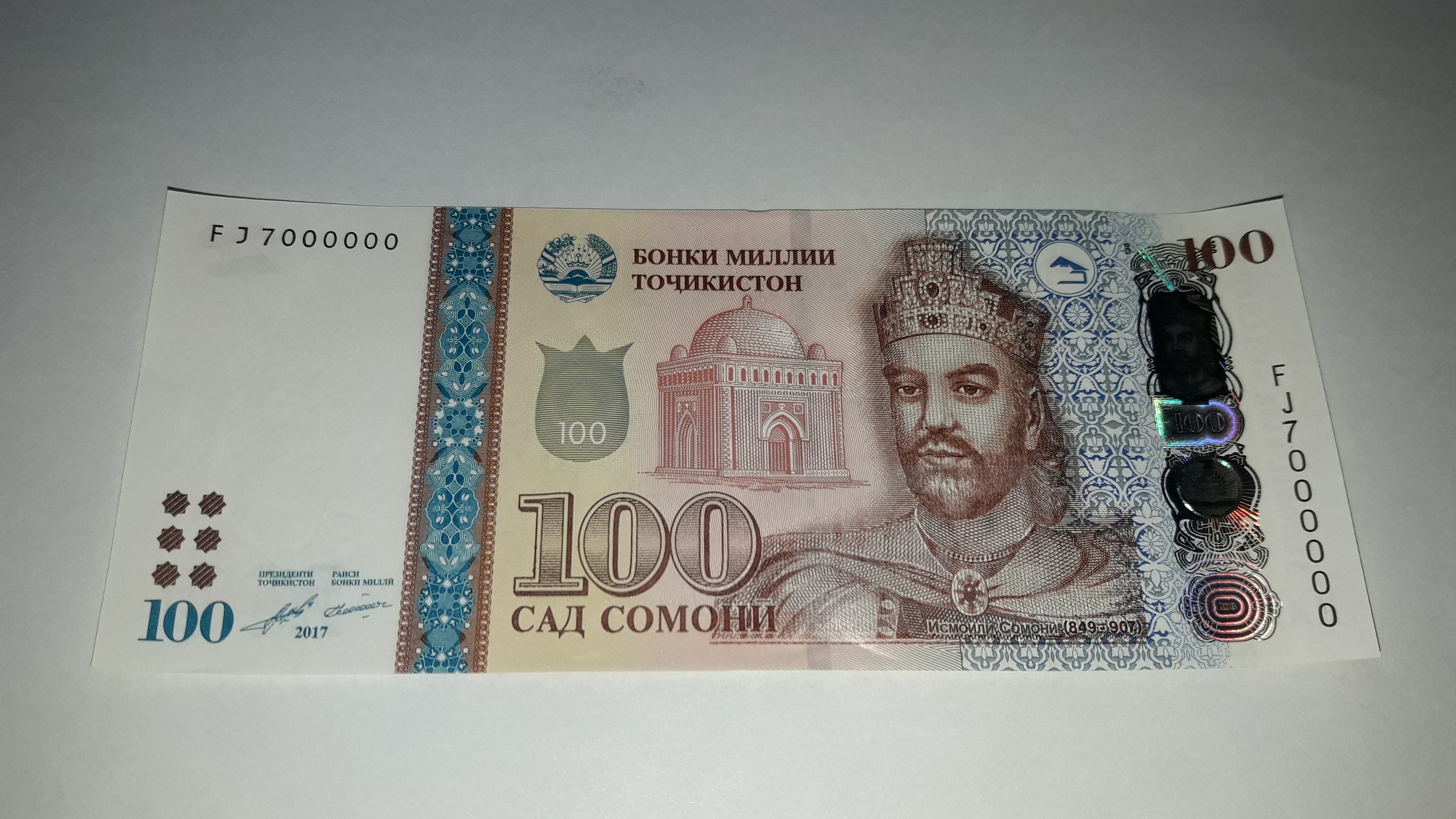 100 сомони Таджикистан 2017 год UNCа Серия FJ 7000000