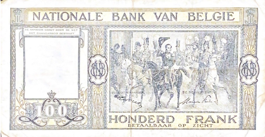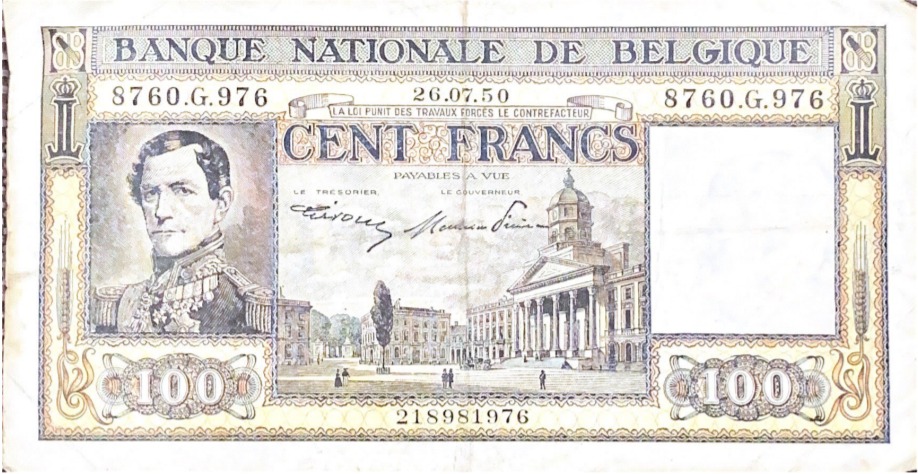 Прошу помощи в примерной оценке 100 франков Бельгия. Цветопередача немного тускней получилась, так как сканировал через телефон. Спасибо за внимание к теме.