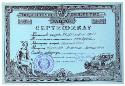 Акционерное общество АВТО, Сертификат. Без года издания. Печать еще с гербом РСФСР. Один из первых кооперативов Ленинграда, в 1991 году был преобразован в акционерное общество. Редкий документ эпохи развала СССР и становления новой России.