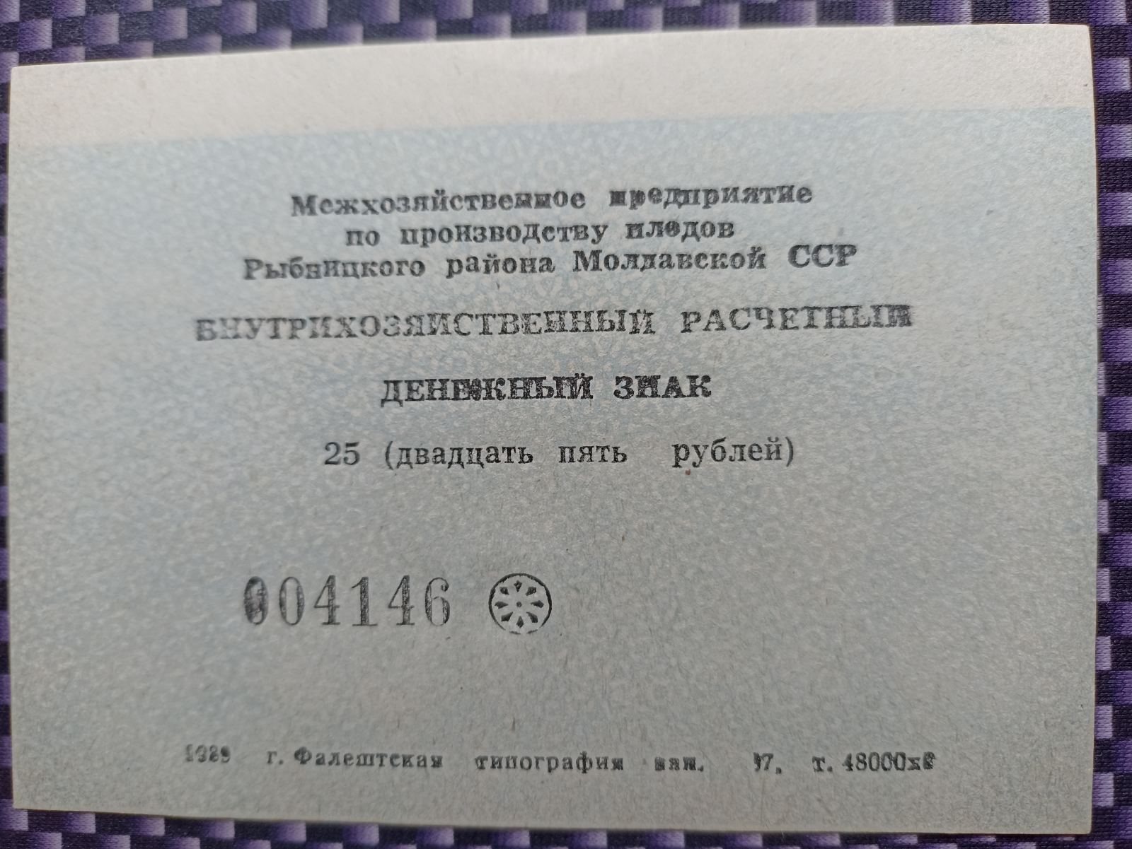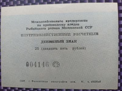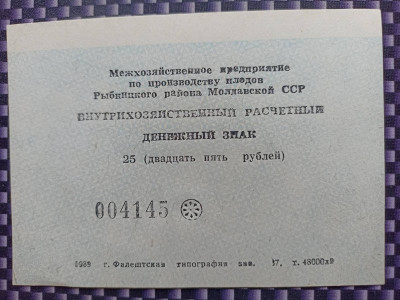 Межхозяйственное предприятие по производству плодов Рыбницкого района Молдавской ССР. Фалештская типография. Номинал 25 рублей. 1989г. Количество 2 штуки. В каталоге не описаны.http://fox-notes.ru/z_rus_chastnik/chastniki_1985.htm . Доставка заказной почтой в любую страну за счет покупателя.