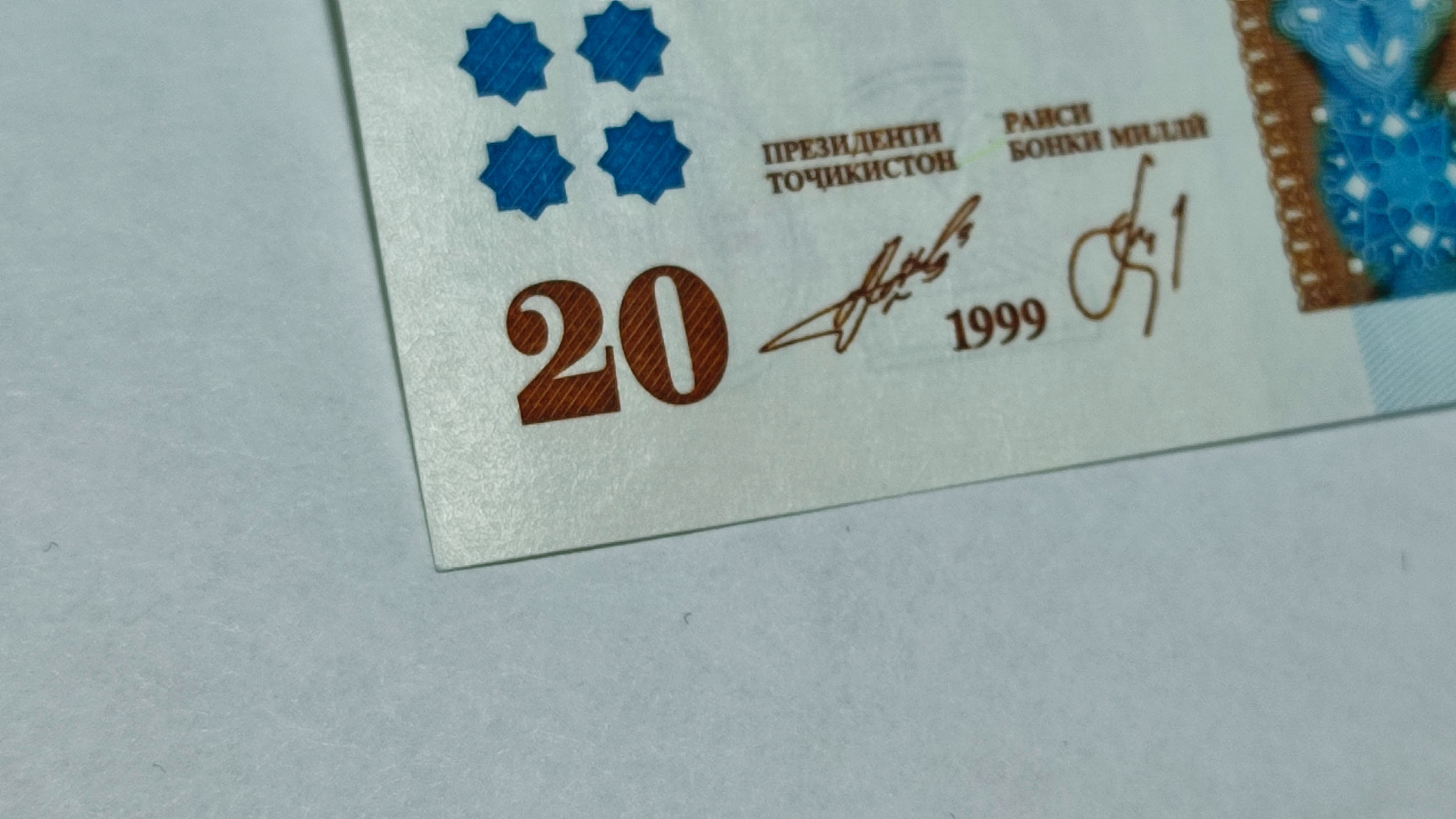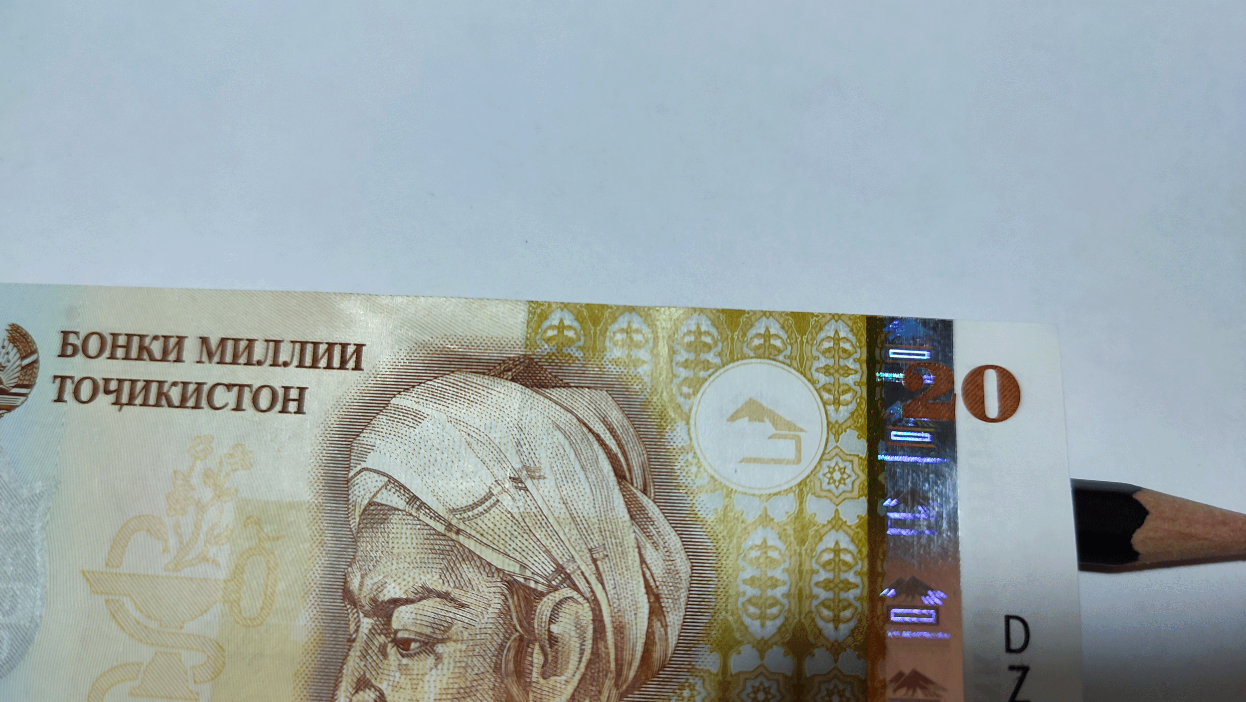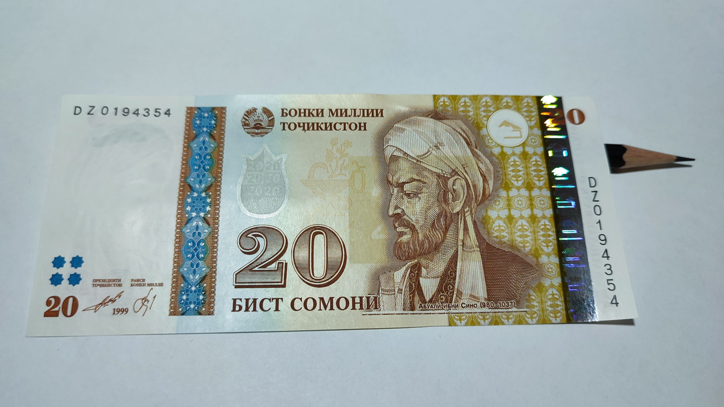 Банкнота серии замещения, найденная в блоке банкнот 20 сомони 1999 года серии DB (подтверждение имеется).