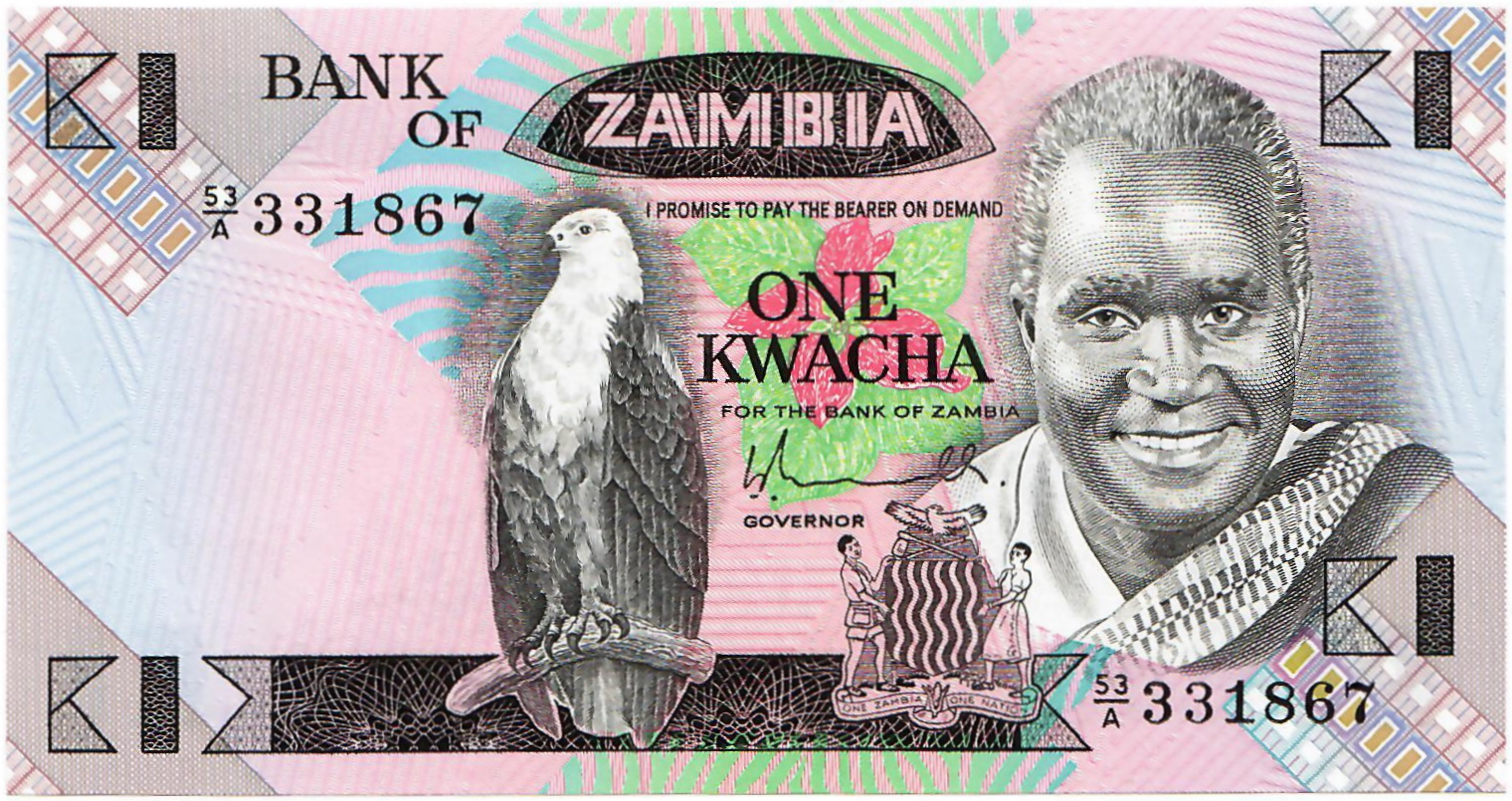 Описание лота: Билет Банка Замбии номиналом 1 квача выпуска (1980) года. 5-й вариант подписи. Без замечаний.