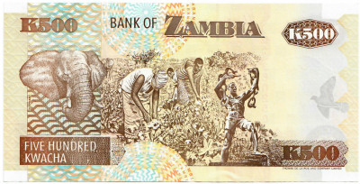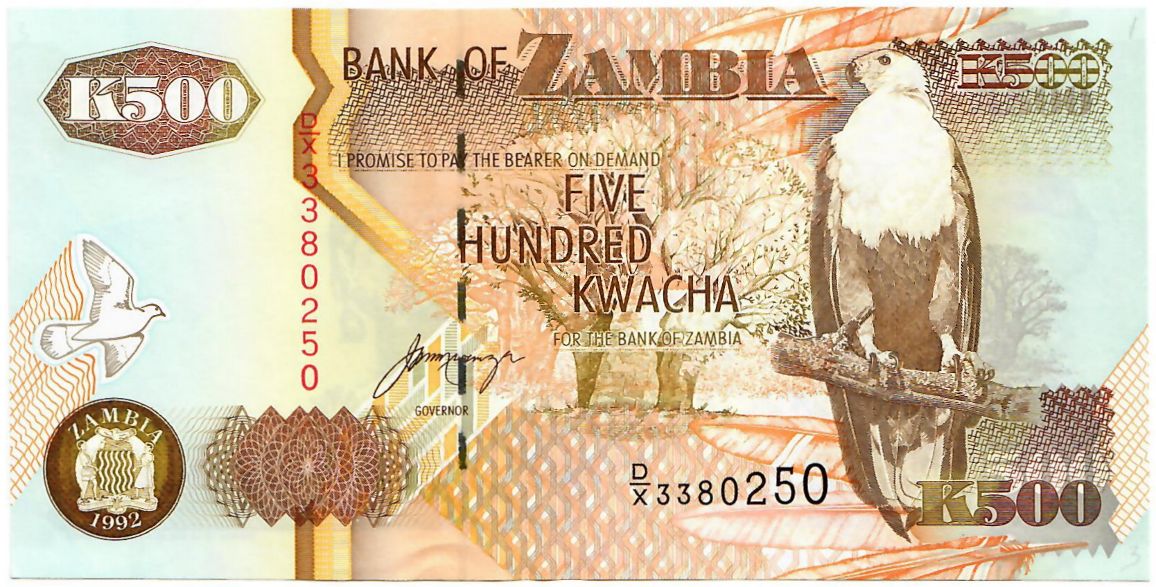 Описание лота: Билет Банка Замбии номиналом 500 квач выпуска 1992 года. 11-й вариант подписи. Выгиб нижней кромки в месте захода металлизированной защитной нити.