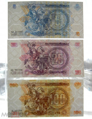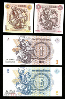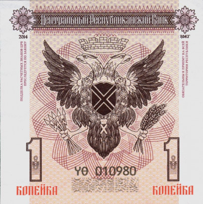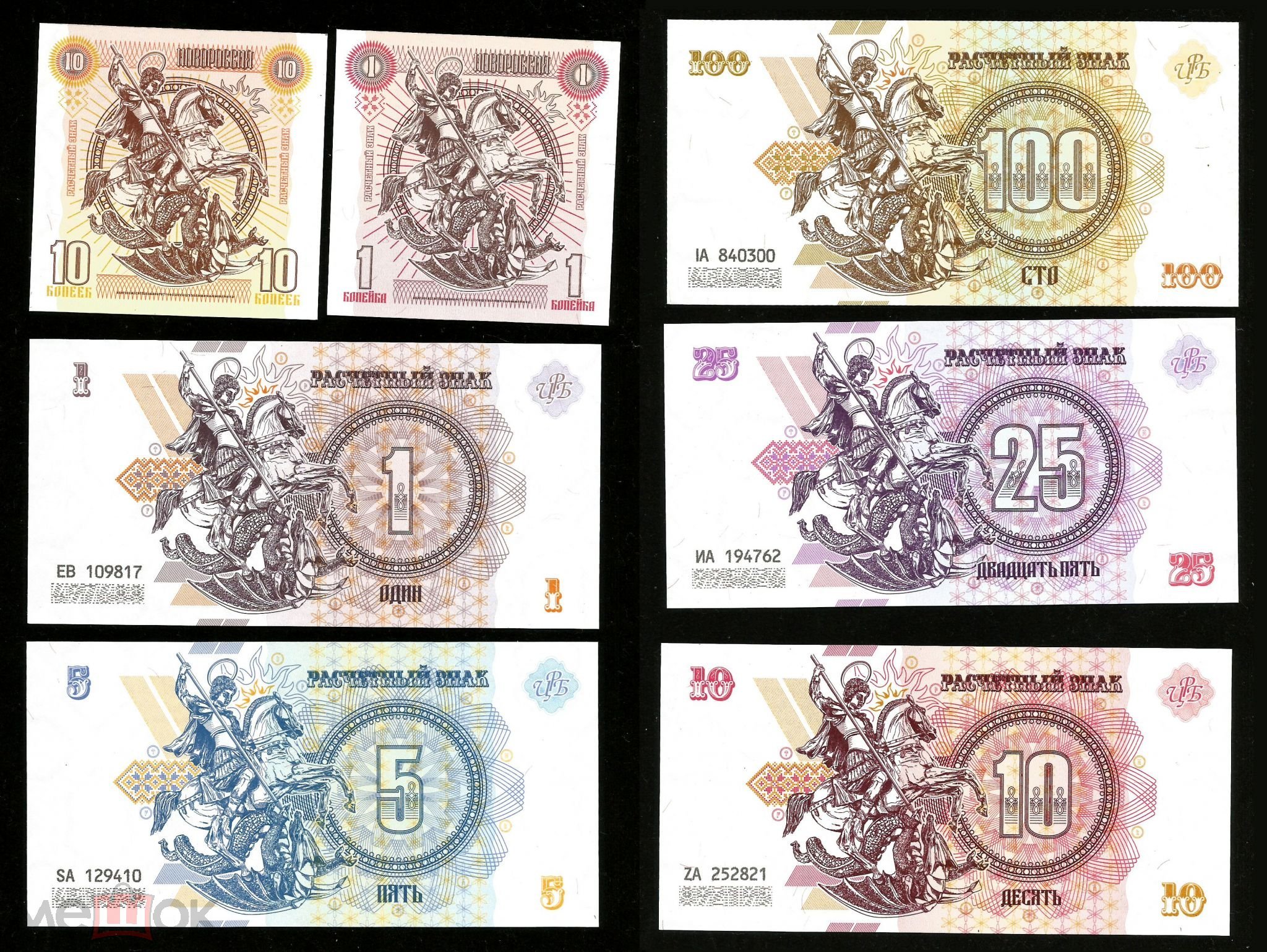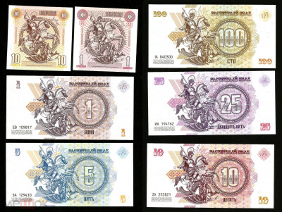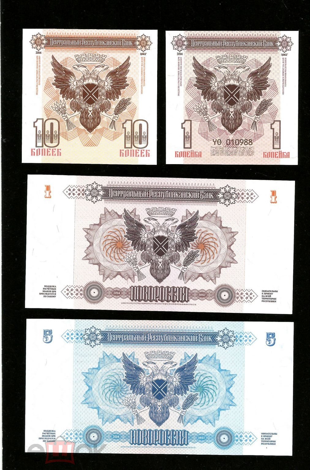 Полный набор из семи оригинальных Бон Новороссии. Присутствуют все виды защиты.Бумага класса В, защитный код, ИК и УФ, водяные знаки, микротекст. Номиналы 1,5,10,25,100 + 1 и 10 копеек. Доставка заказной почтой за счет покупателя +250 руб.