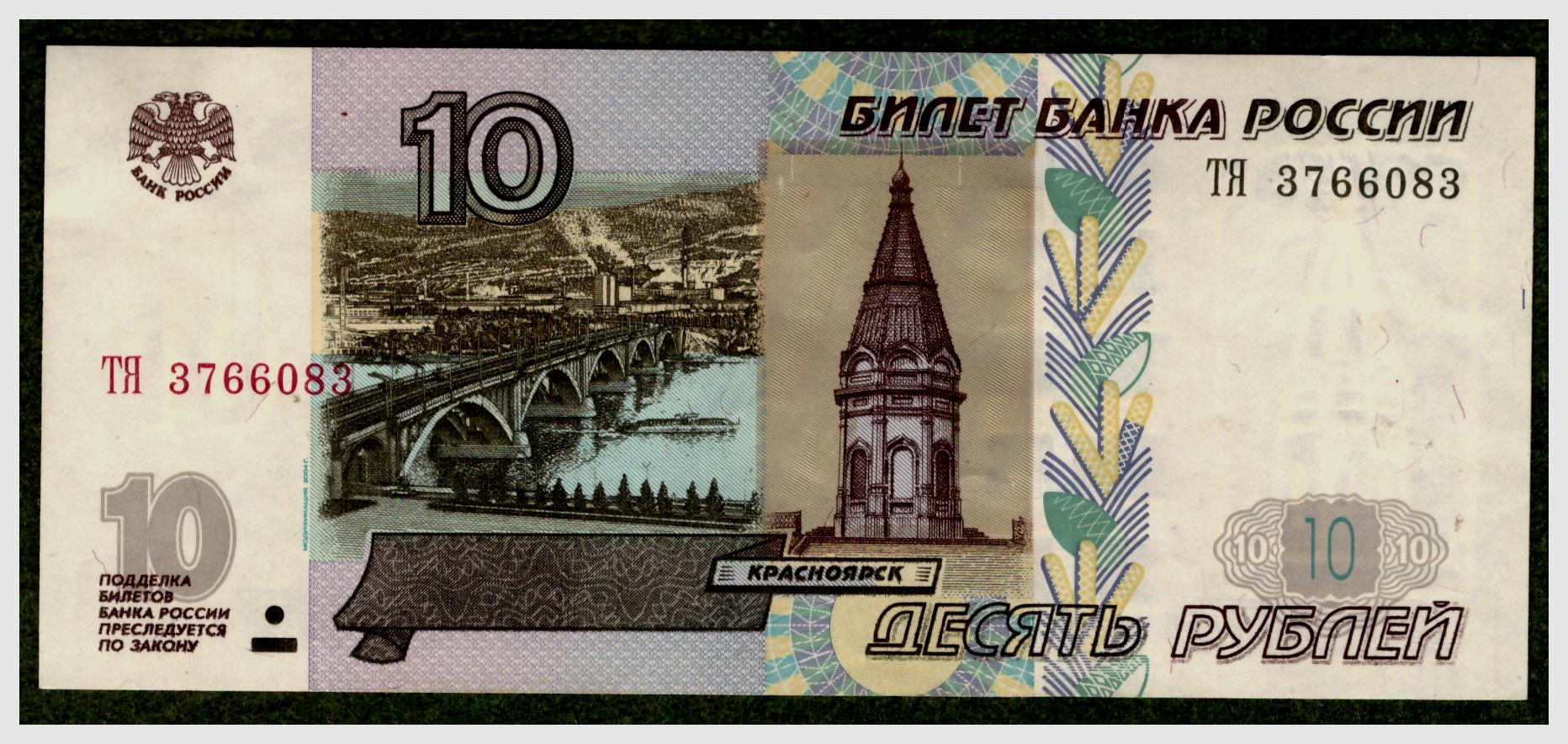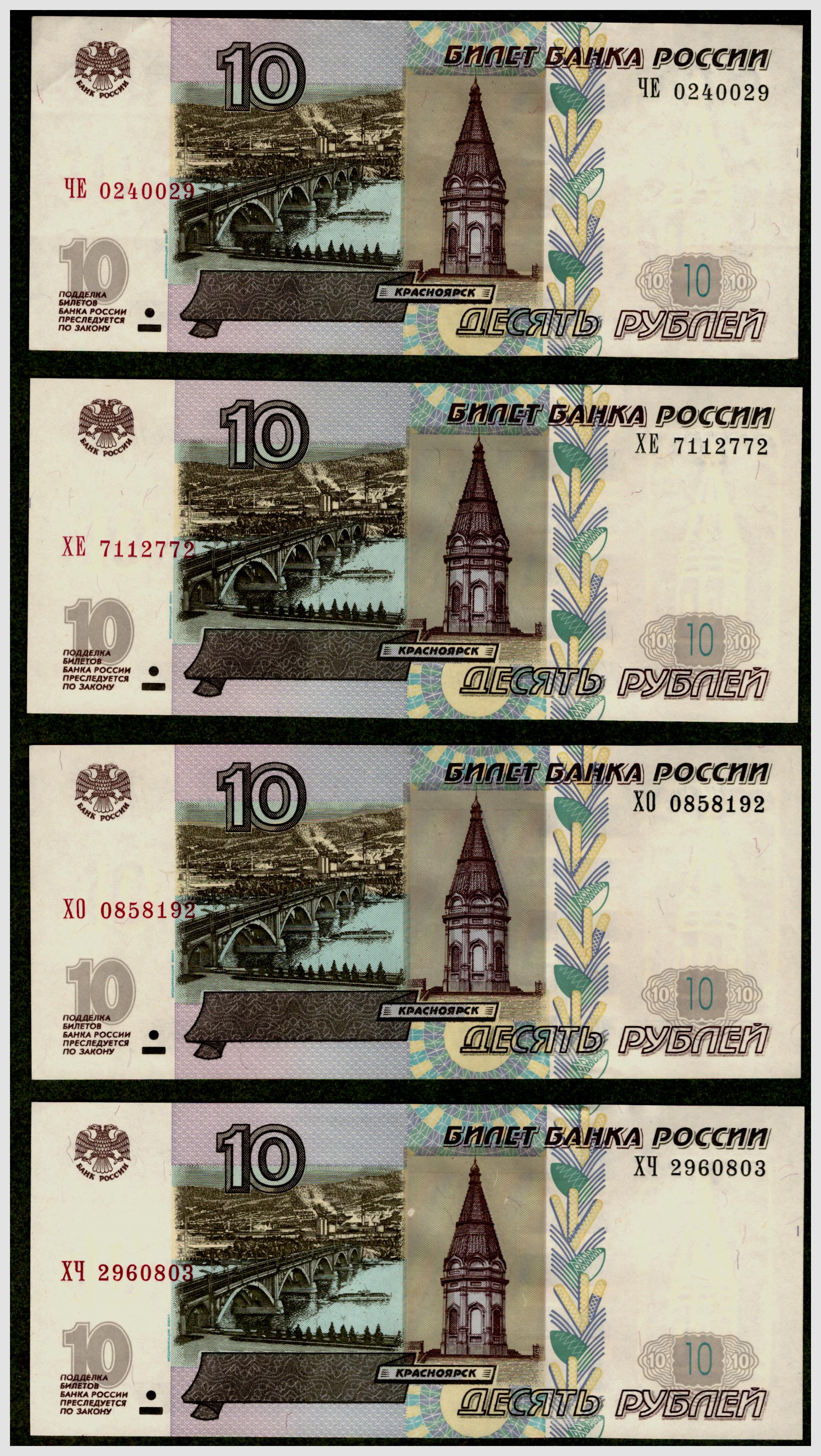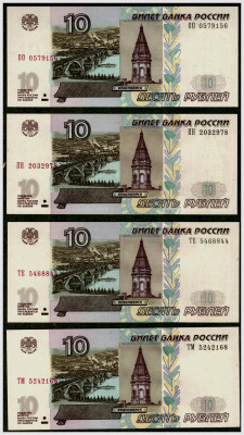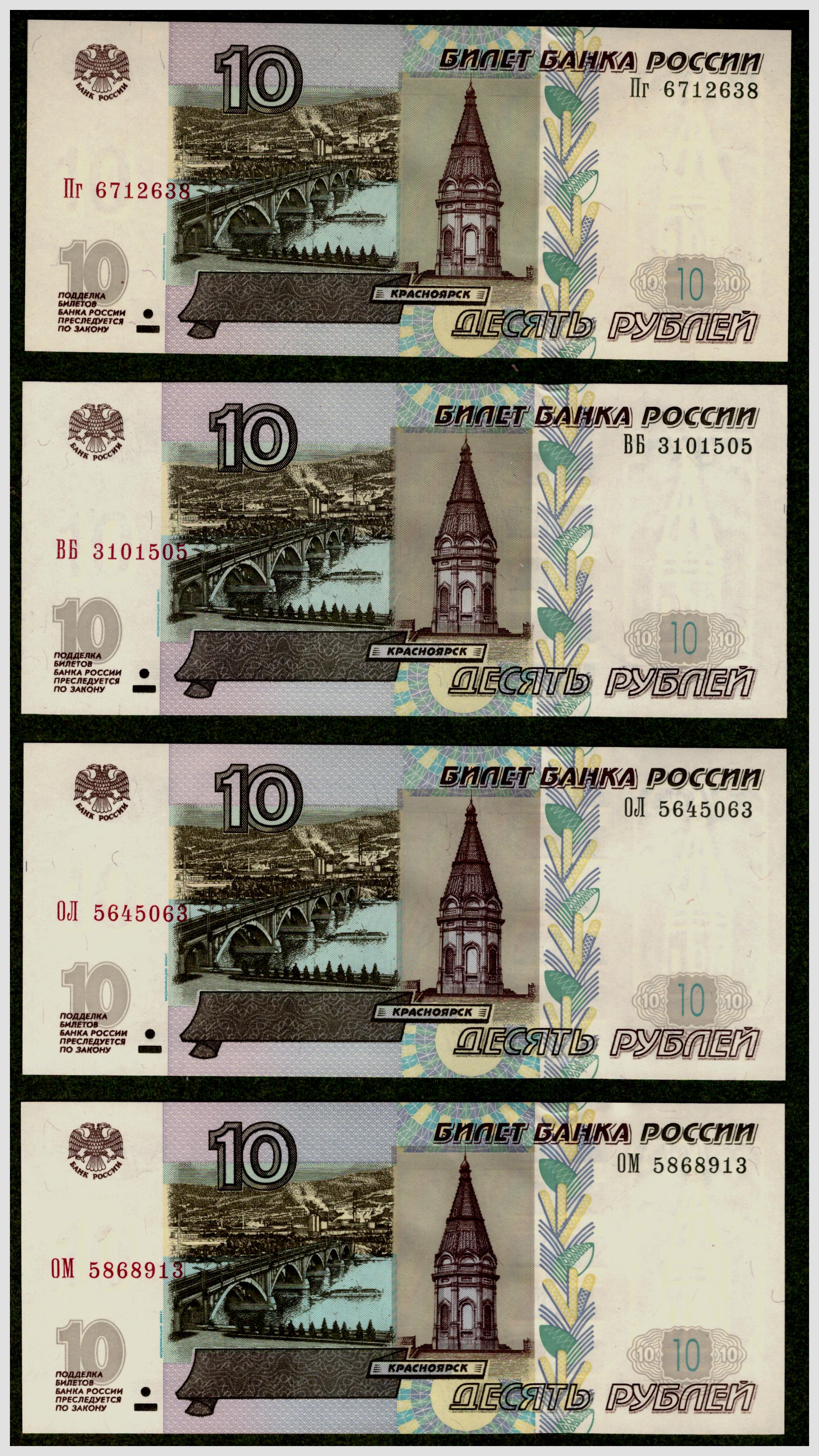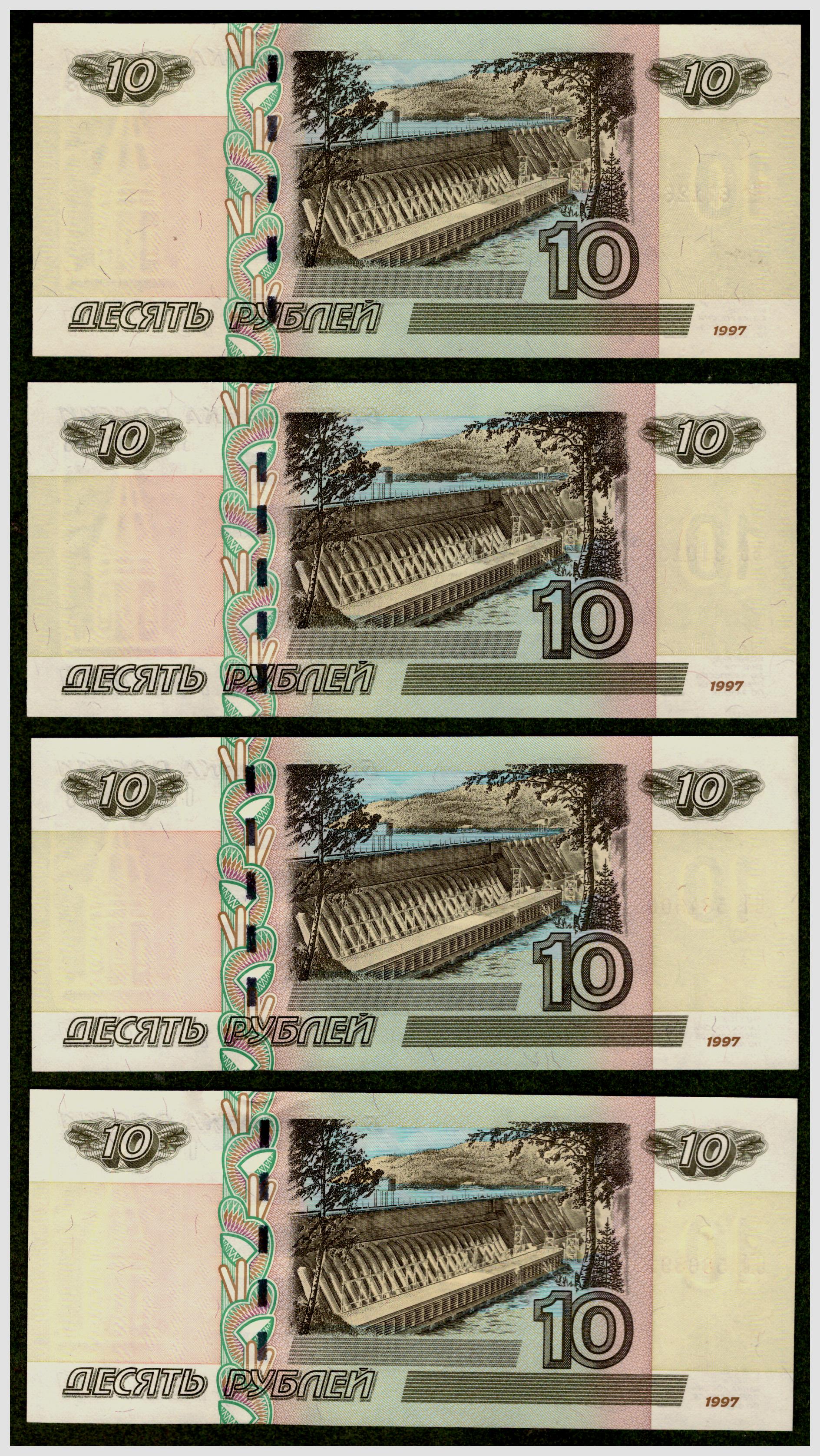 Тринадцать банкнот РФ 10 рублей 1997 (модификации 2004)