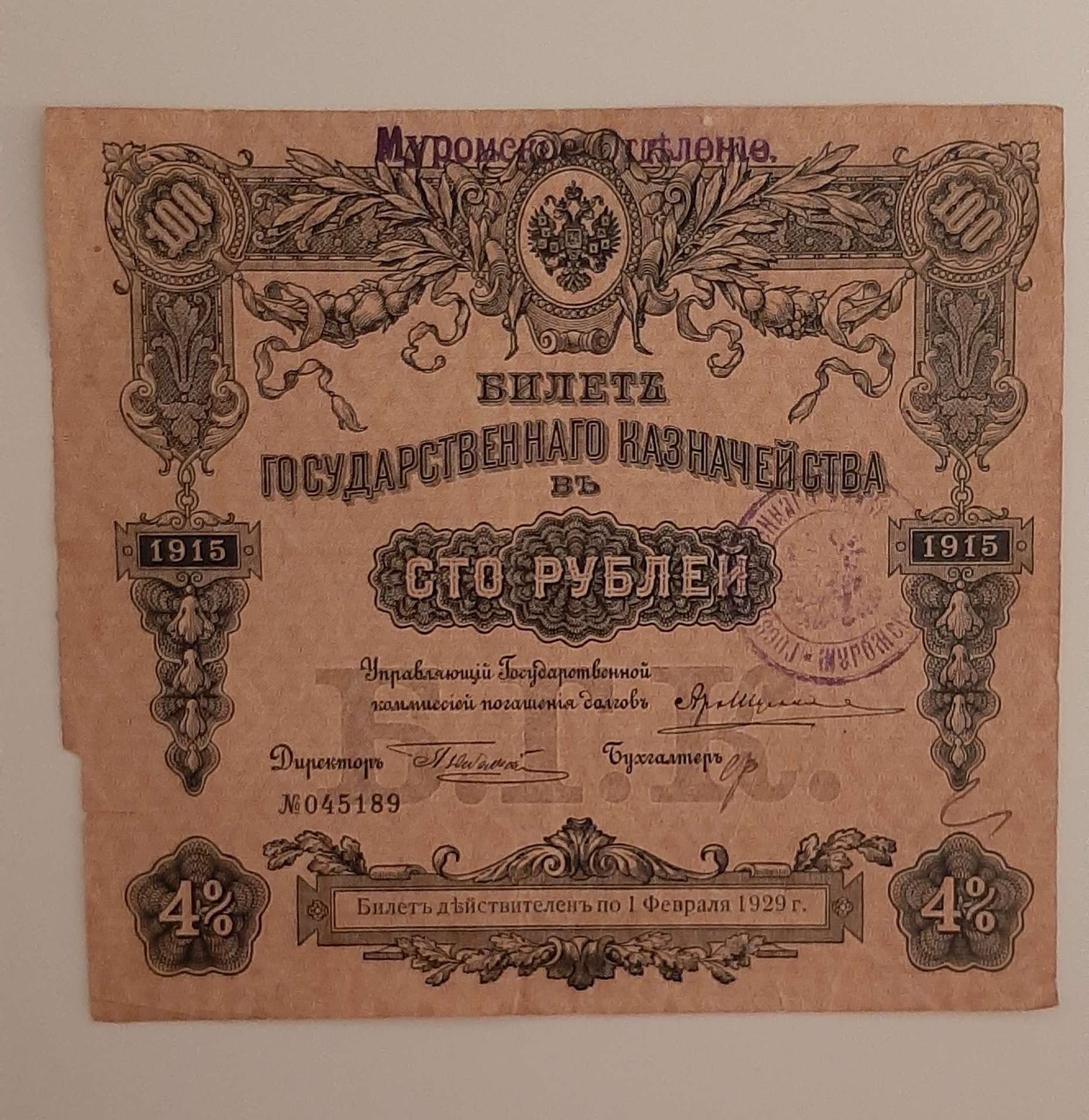 Приветствую просьба помочь оценить билет государственного казначейства в 100 рублей,1915 года с надпечаткой муромского отделения и были ли аналогичные бумаги ,с уважением!