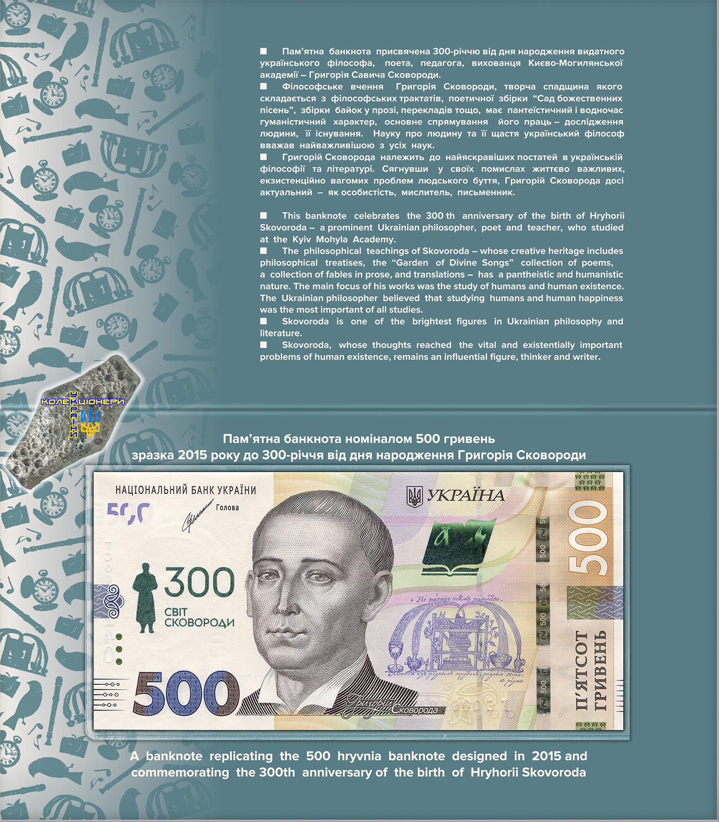 Пам’ятна банкнота номіналом 500 гривень зразка 2015 року до 300-річчя від дня народження Григорія Сковороди 50 000 (з яких: 30000 – у сувенірній упаковці, до 20000 – у конвертах)