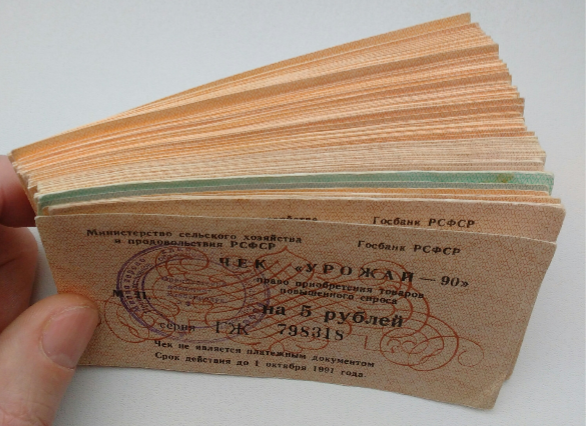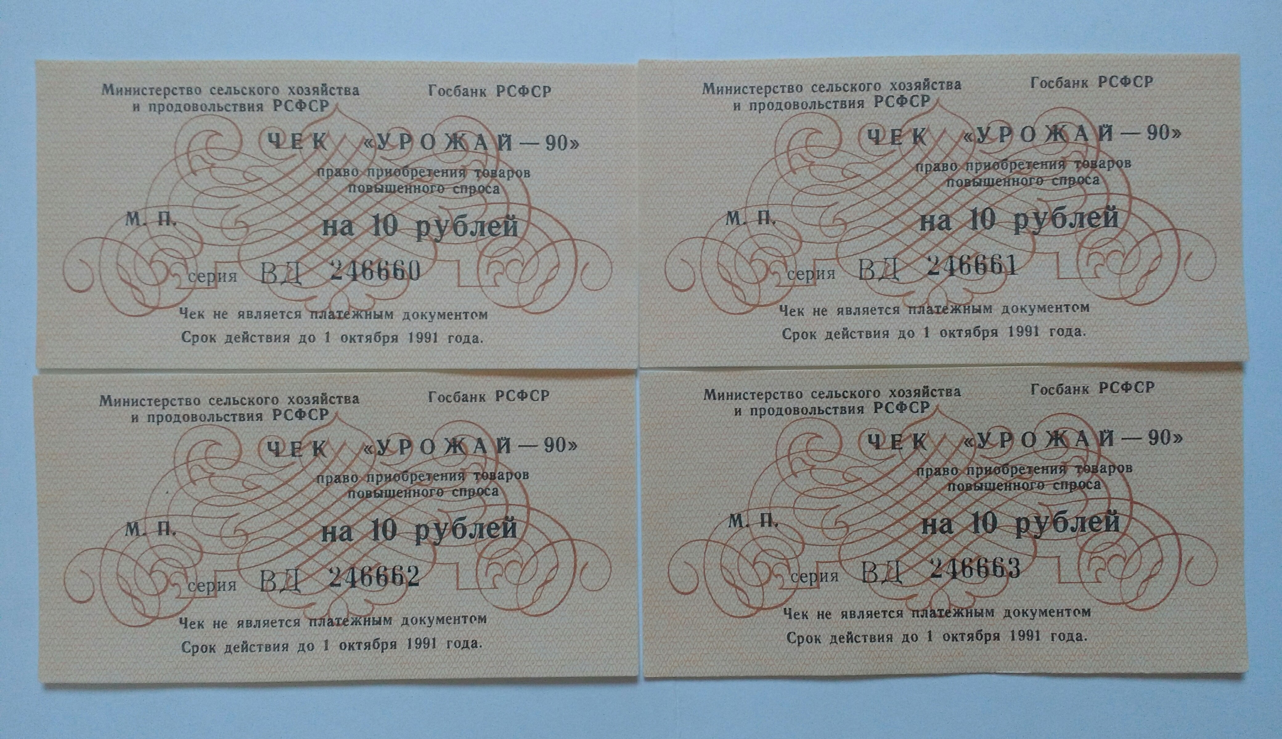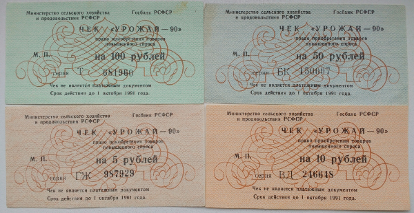Приветствую! Имеются вот такие суррогаты денег - чеки "Урожай - 90", в количестве 105 штук, из них только 7 штук с печатью, остальные почти все в прессе. Будет ли к ним интерес. Хотелось бы продать всё одним лотом.