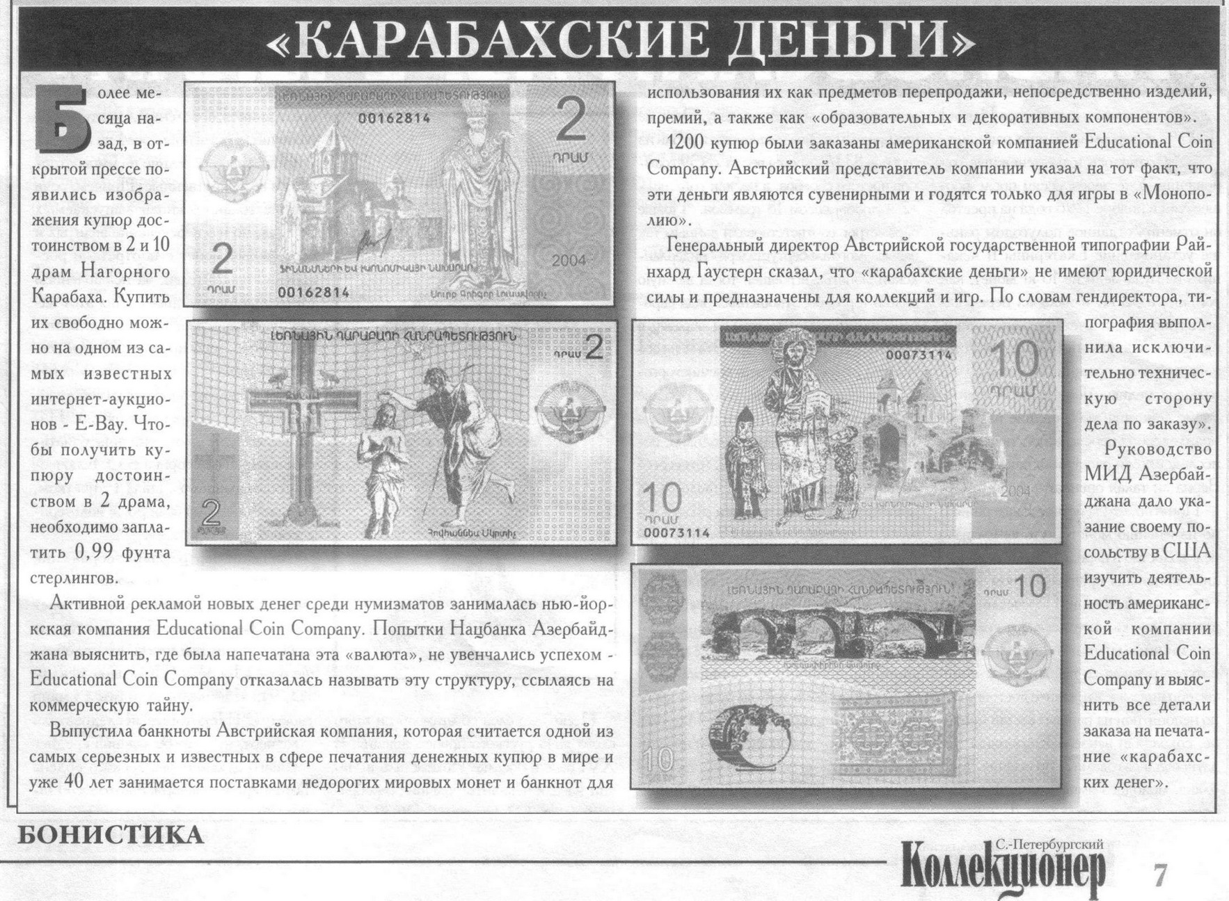 Есть ли какая то статья по банкнотам Нагорного Карабаха? Из журнала, из газеты или другое...