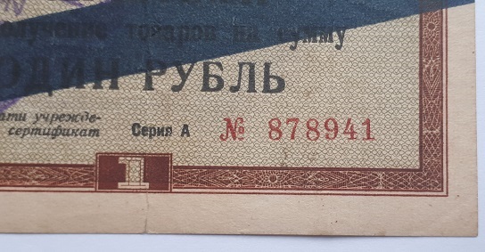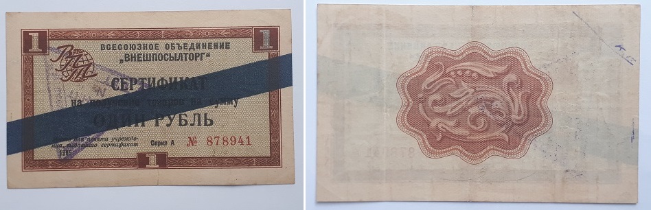 Сертификат чек Внешпосылторг 1 рубль 1965 серия А № 878941.