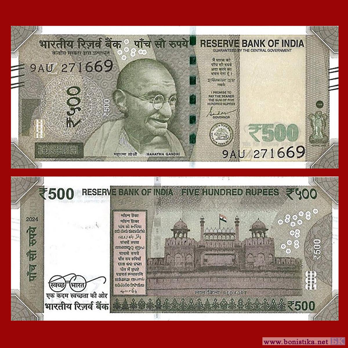 Резервный банк Индии (Reserve Bank of India; भारतीय रिज़र्व बैंक) выпустил в обращение новый тираж банкнот номиналом 500 индийских рупий образца 2016 года.