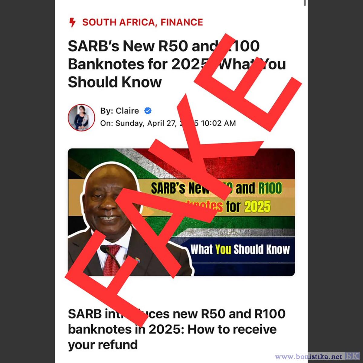 В ответ на это Южно-Африканский резервный банк заявил, что эта статья ложная. Он не будет выпускать новые банкноты достоинством 50 и 100 рандов в 2025 году. "Последние банкноты были выпущены в 2023 году с улучшенными функциями защиты от подделки", - отмечается в официальном заявлении банка.
