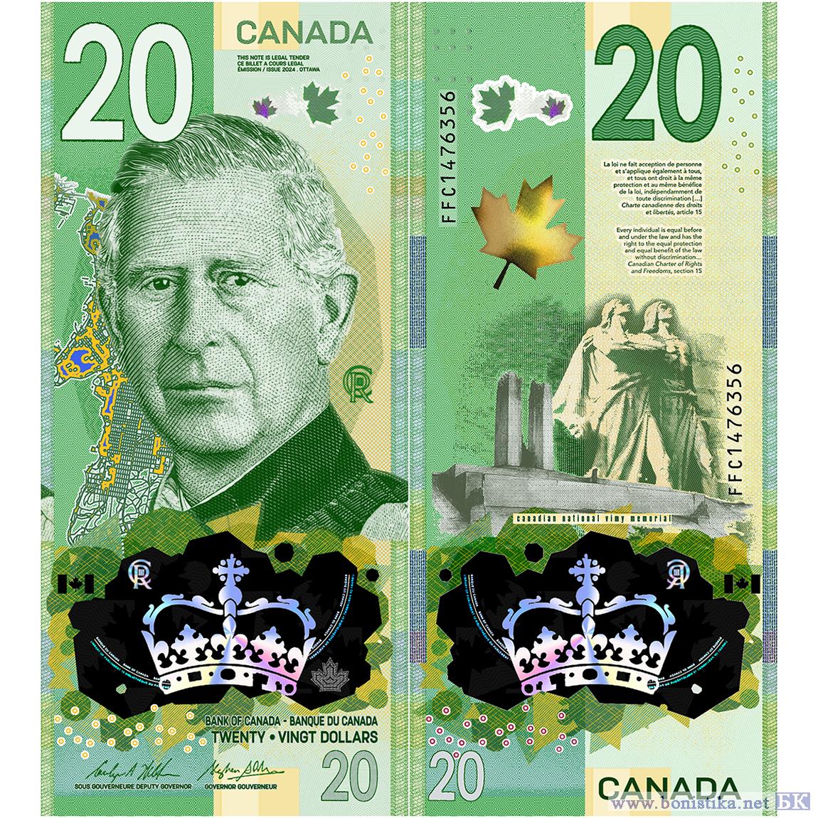 Банк Канады (Bank of Canada; Banque du Canada) сообщил, что полимерная купюра номиналом 20 канадских долларов с портретом правящего британского монарха появится в наличном обращении в феврале 2027 года.
