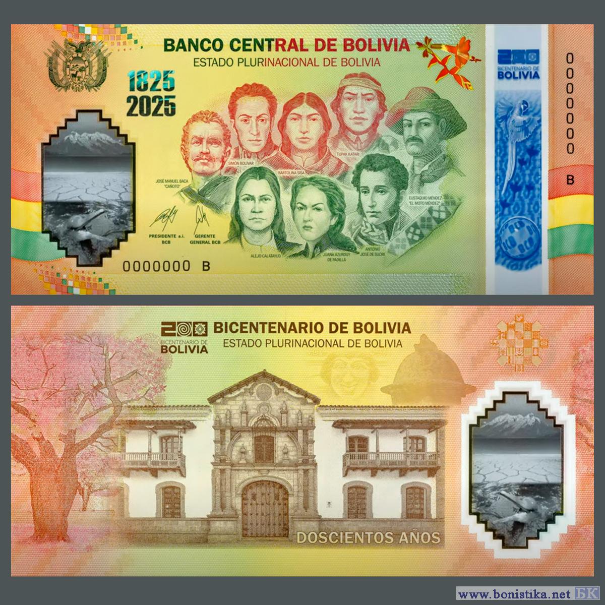 На лицевой стороне памятной банкноты изображены вожди коренных народов Бартолина Сиса (Bartolina Sisa) и Тупак Катари (Túpak Katari); креольские партизаны Хуан Асурдуй де Падилья (Juan Azurduy de Padilla), Алехо Калатаюд (Alejo Calatayud), Мото Мендес (Moto Mendez) и Хосе Мануэль Бака «Каньото» (José Manuel Baca “Cañoto”), а также освободители Симон Боливар (Simón Bolívar) и Антонио Хосе де Сукре (Antonio José de Sucre).