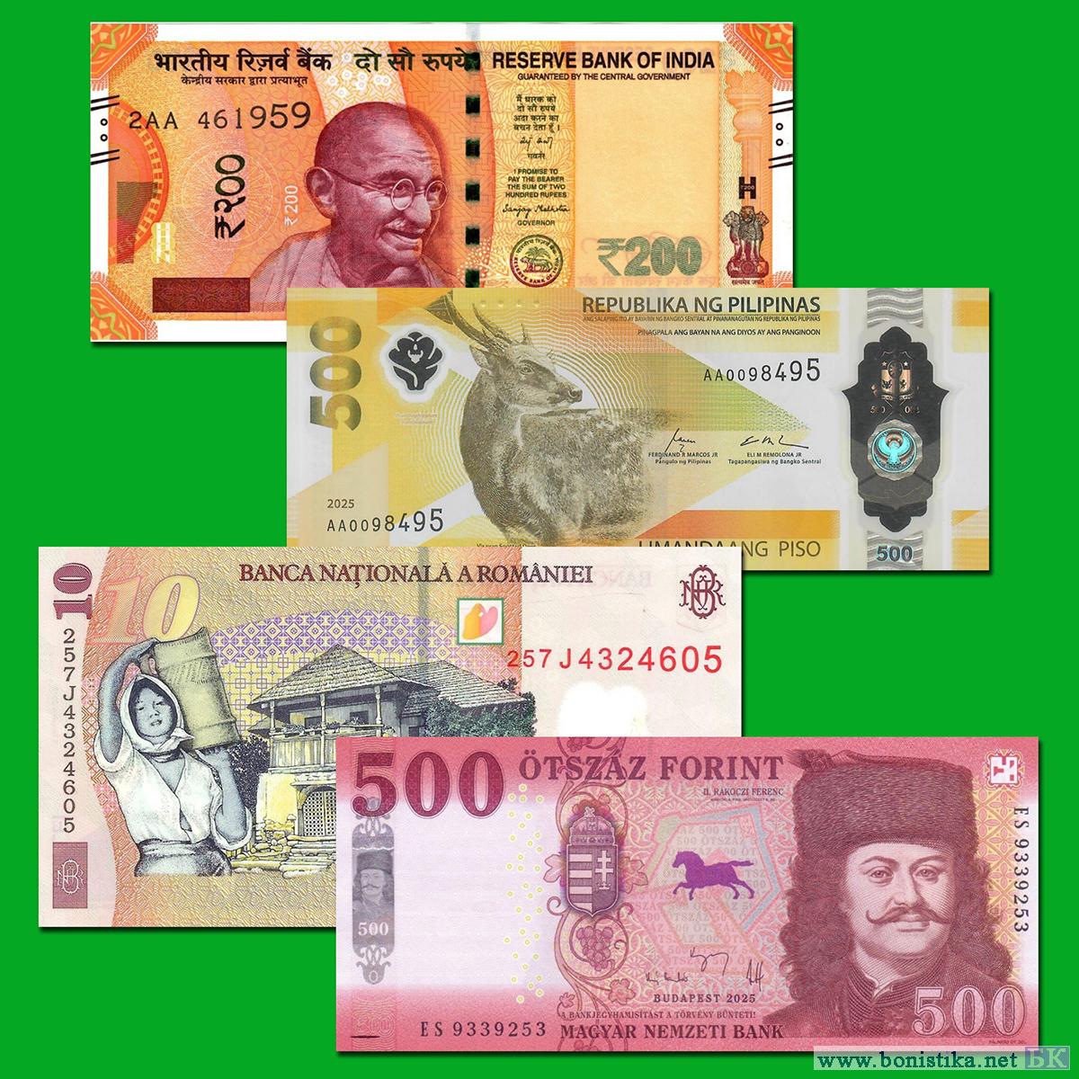 В наличном денежном обращении зафиксированы обновленные банкноты нескольких стран. Так, Резервный банк Индии (Reserve Bank of India; भारतीय रिज़र्व बैंक) выпустил новый тираж купюр номиналом 200 рупий образца 2017 года с подписью действующего губернатора Санджея Малхотра (Sanjay Malhotra) и датой 2025 г.