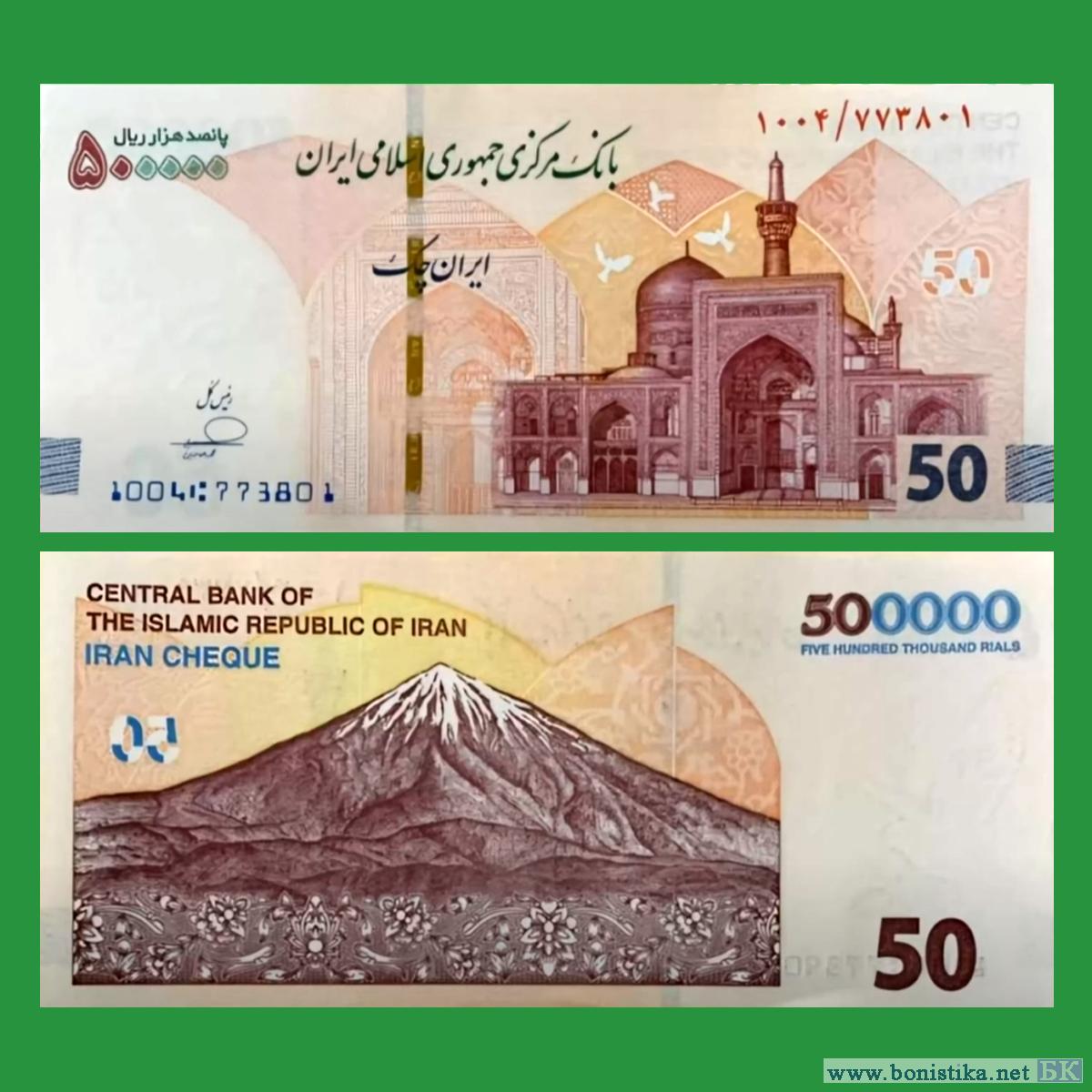 Центральный банк Исламской Республики Иран (بانک مرکزی جمهوری اسلامی ایران) выпустил в обращение модернизированные иранские чеки номиналом 500 000 риалов. Описание новых денежных знаков опубликованы в иранских СМИ.