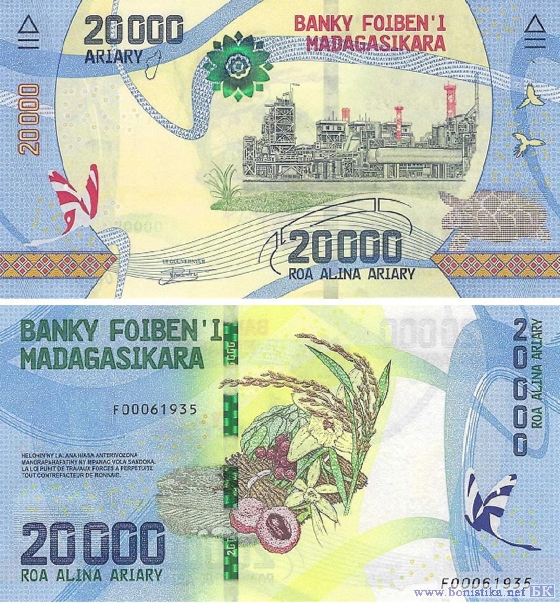 Центральный банк Мадагаскара (Banky Foiben'i Madagasikara, Banque Centrale de Madagascar) сообщил, что выпускает в обращение новые тиражи банкнот номиналом 10 000 и 20 000 ариари образца 2017 года. В настоящее время подтверждена эмиссия модернизированных банкнот 20 000 ариари.