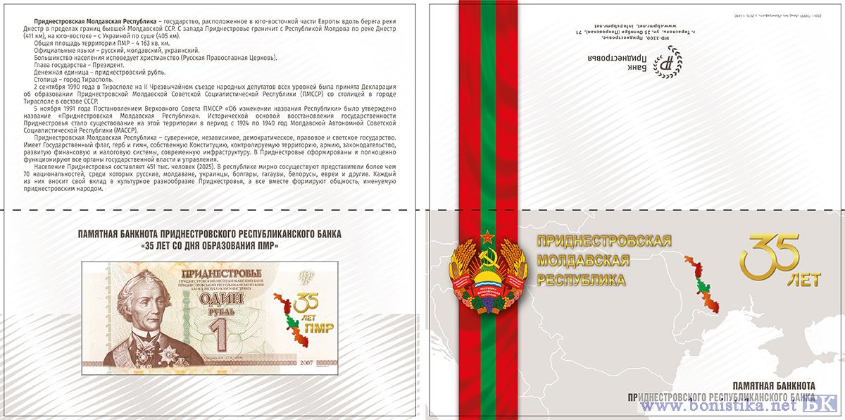 Формат, общий дизайн и технические характеристики памятной банкноты соответствуют находящейся в обращении банкноте номиналом 1 рубль образца 2007 года модификации 2012 года, с нанесением в правом поле лицевой стороны банкноты специальной маркировки в виде выполненного в цветах флага Приднестровской Молдавской Республики картографического изображения территории Приднестровской Молдавской Республики и расположенной справа надписи в три строки «35 ЛЕТ ПМР».