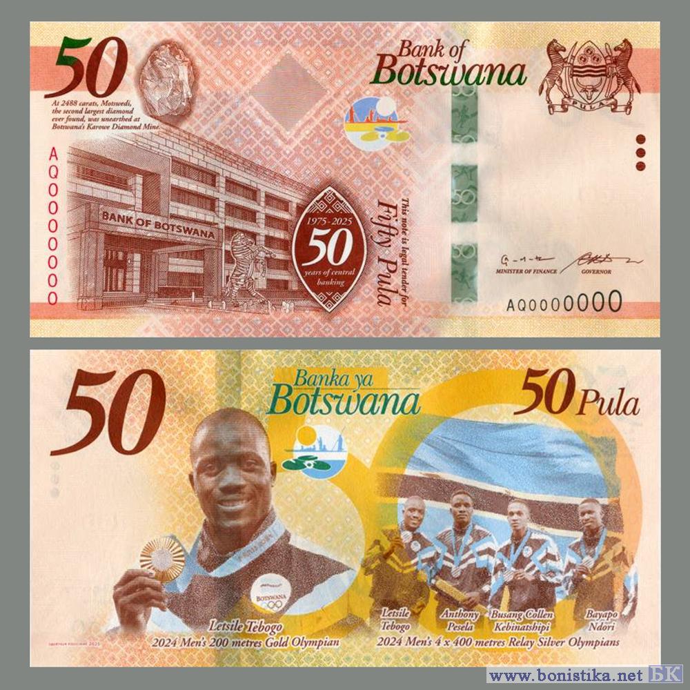 Банк Ботсваны (Bank of Botswana; Banka ya Botswana) объявил, что с 6 февраля 2026 года начинает выпуск в обращение памятных банкнот номиналом 50 пула, анонсированную в сентябре 2025 года президентом страны Думой Гидеоном Боко (Duma Gideon Boko).