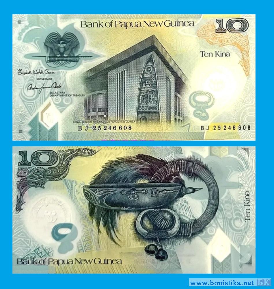 Банк Папуа - Новой Гвинеи (Bank of Papua New Guinea, Beng bilong Papua Niugini) выпустил тираж полимерных банкнот номиналом 10 кина образца 2020 года. Тираж подписала действующая губернатор банка Элизабет Гения (Elizabeth Genia), до этого исполнявшая обязанности губернатора.
