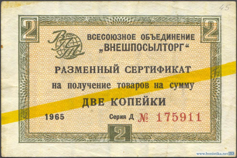 СССР, Заменители валюты, 1965, ВнешПосылТорг, 2 копейки, желтая полоса
