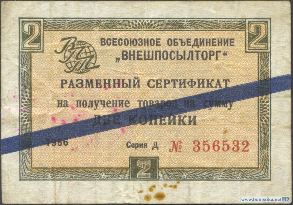 СССР, Заменители валюты, 1966, ВнешПосылТорг, 2 копейки, синяя полоса
