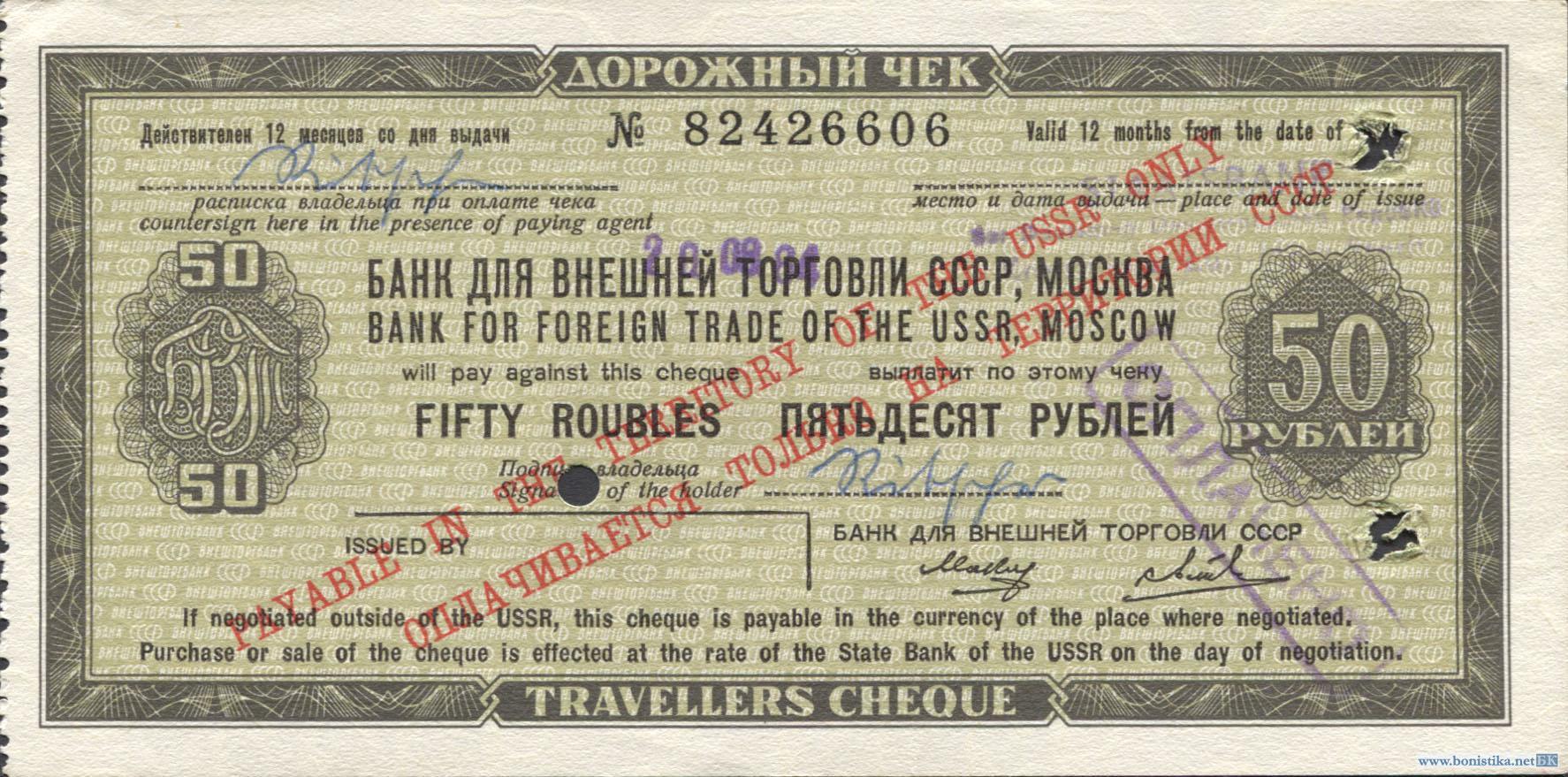 СССР, Заменители валюты, 1984, Дорожный чек, 50 рублей, Светличный, гашенный