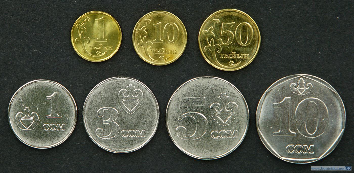 Замовити: Набор 1, 5, 10 тыин, 1, 3, 5, 10 сомов 2008-2009 гг.