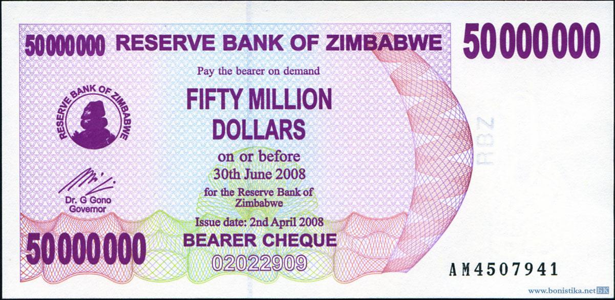 Зимбабве, 2008, 50 миллионов долларов, чек на предъявителя