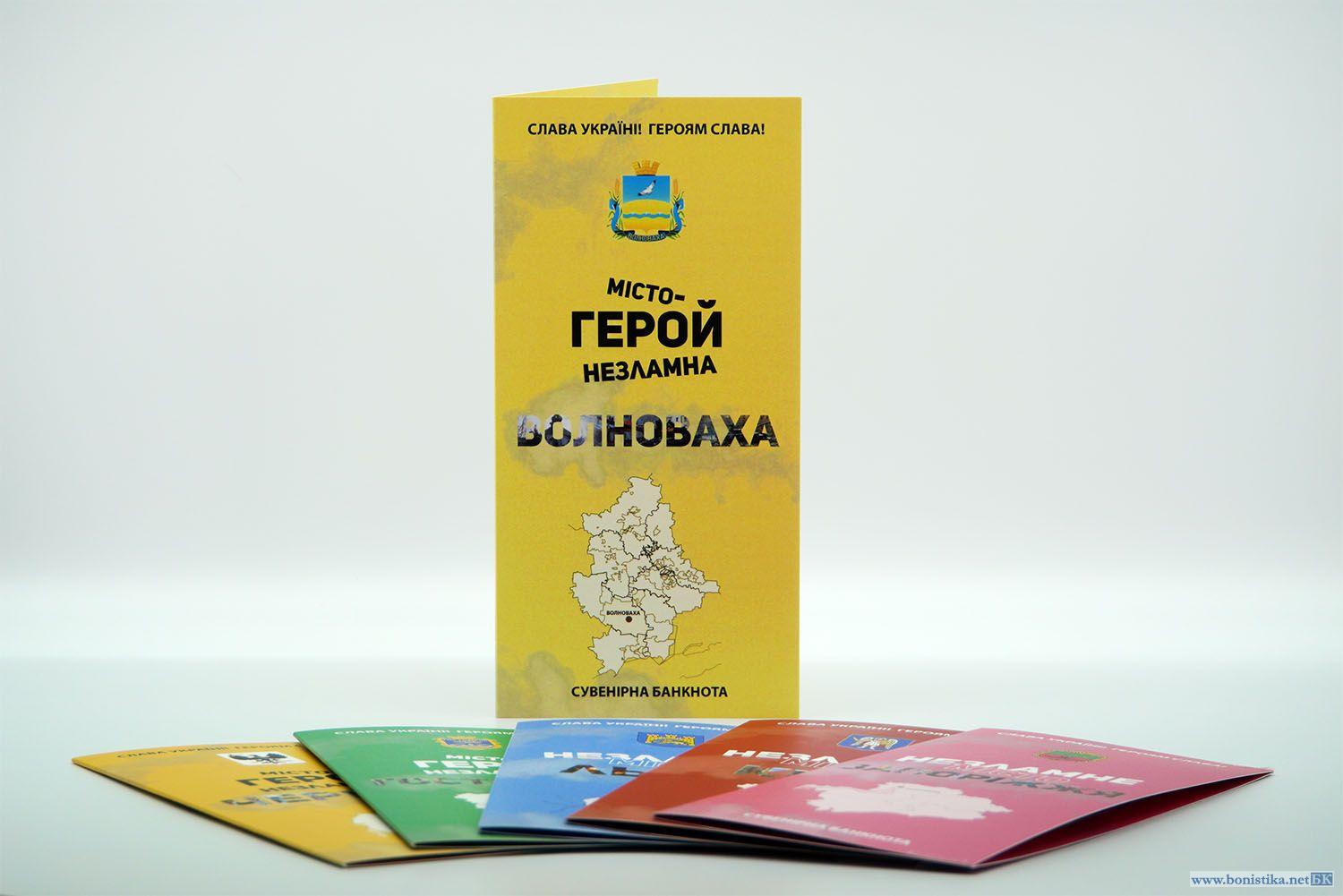 Замовити: 20 гривен, сувенирная банкнота 'Волноваха', в буклете